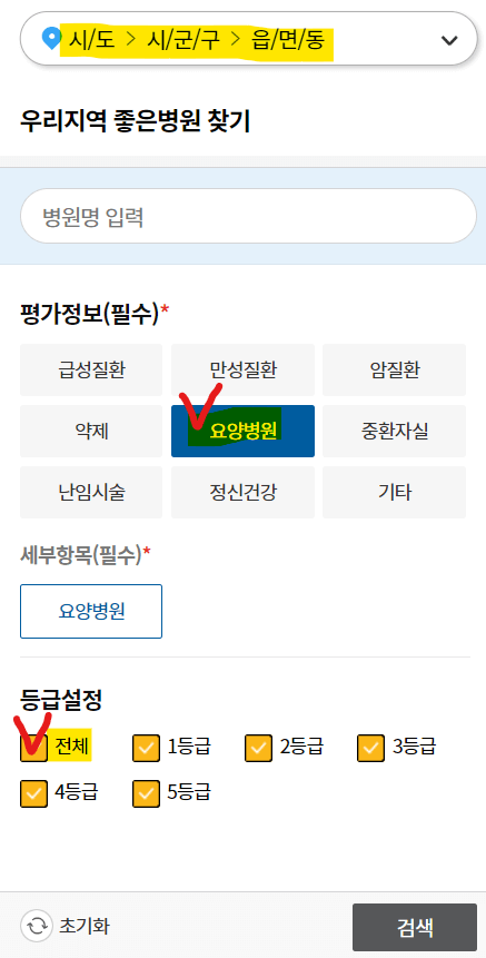 ③ 순서대로 [요양병원]을 선택, [지역]을 설정하고 [요양병원], [등급]을 선택 후 검색하세요.